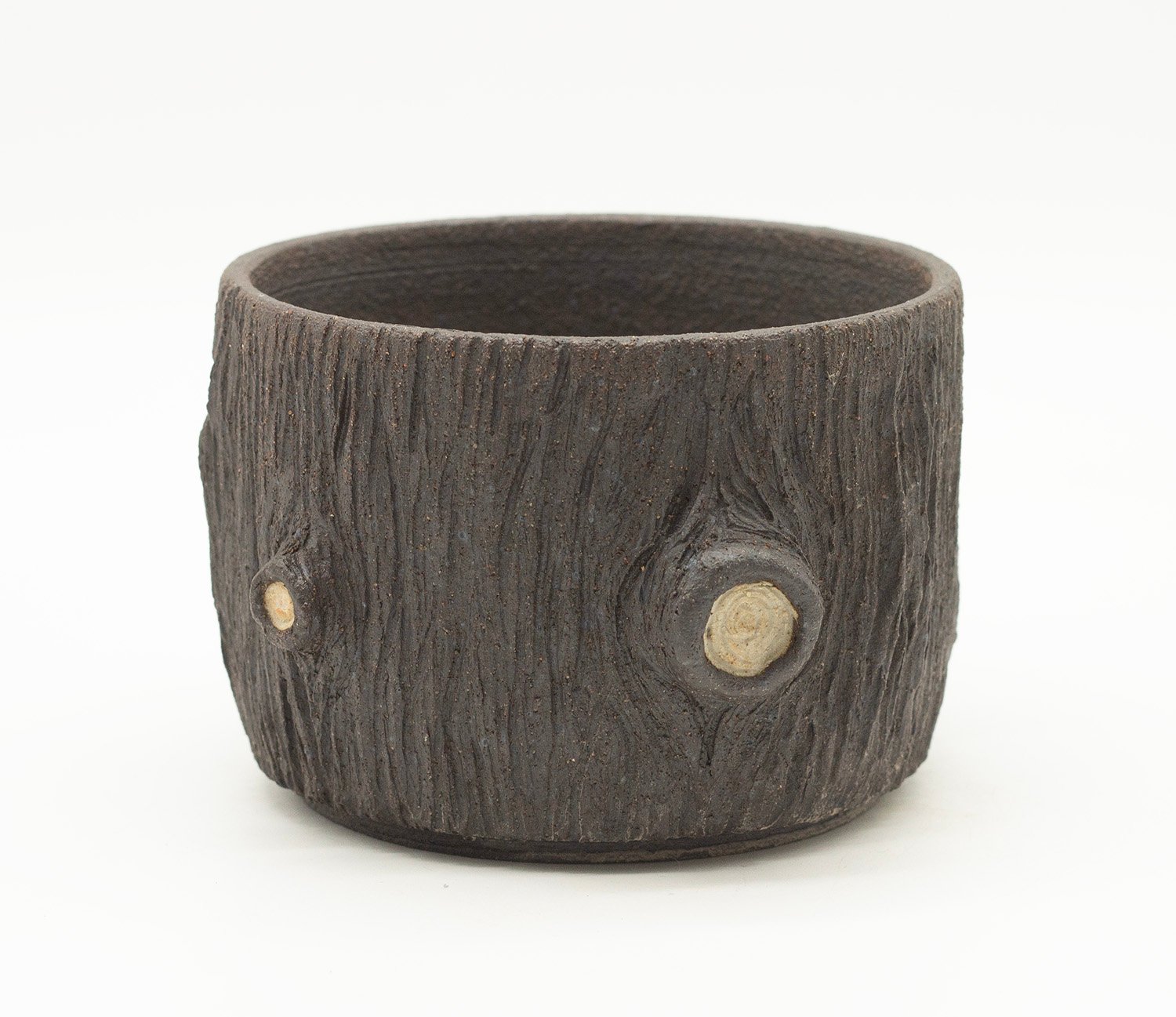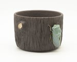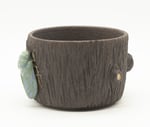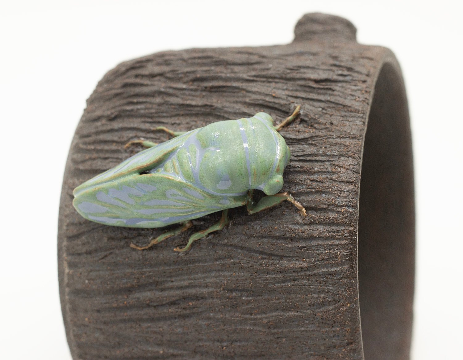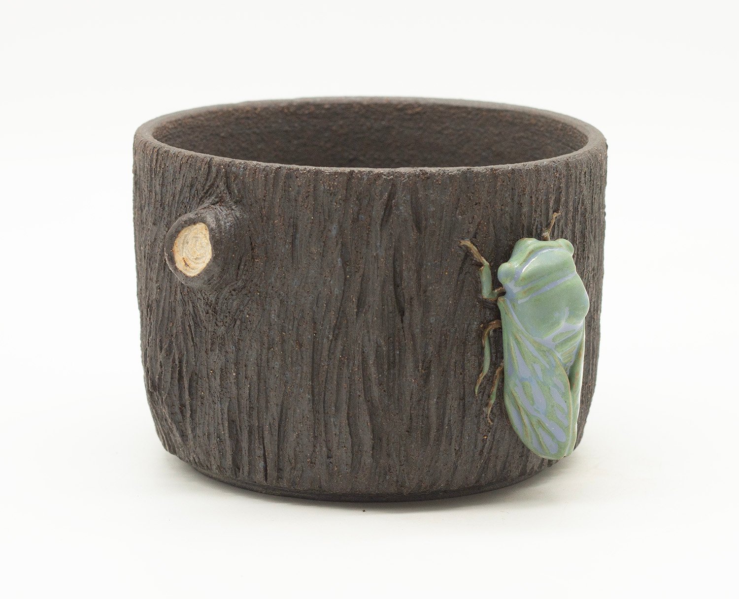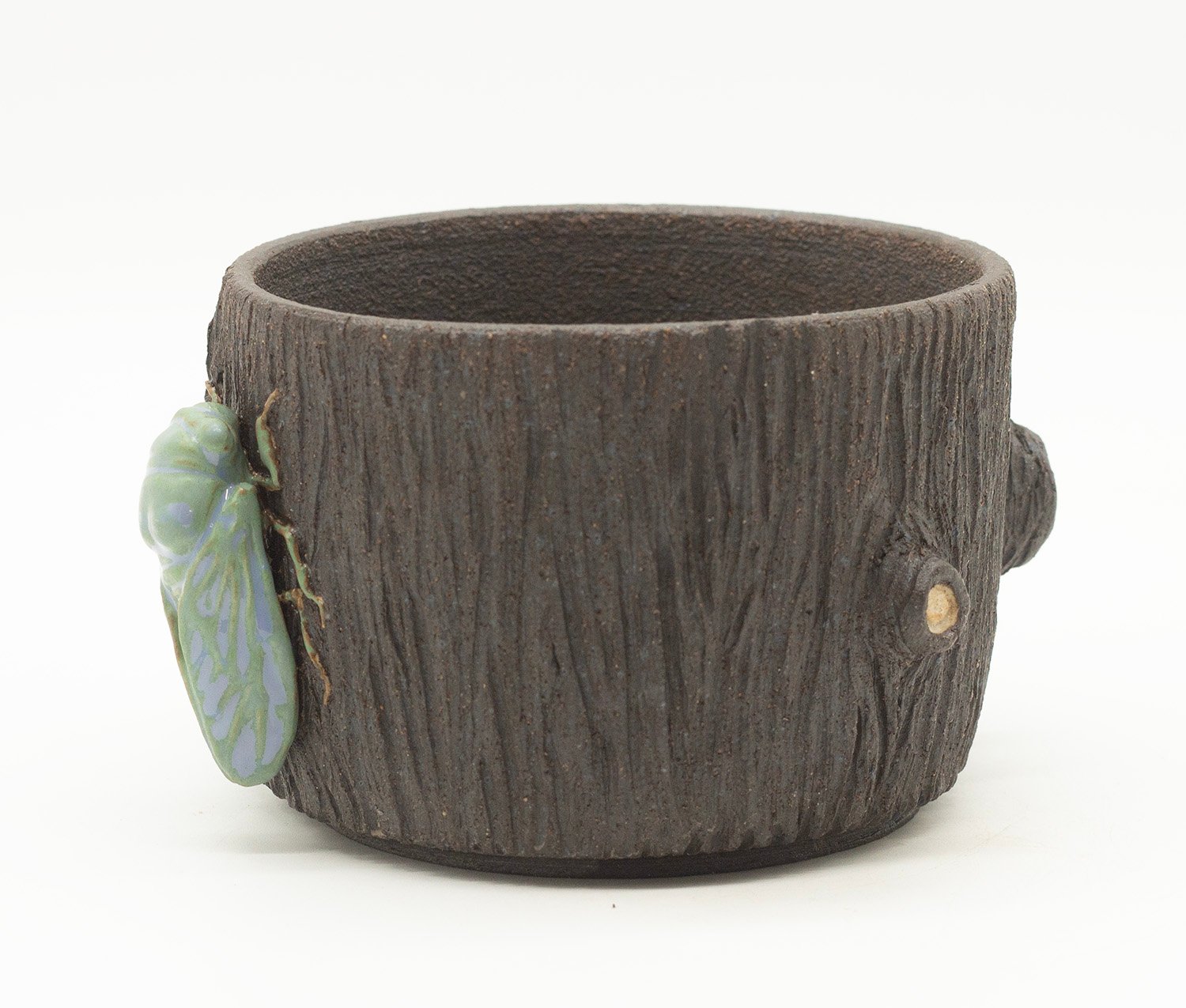 Stoneware planter (with drainage hole) featuring tree texture details and sculpted porcelain cicada. 3" x 4.5" x 4.5"