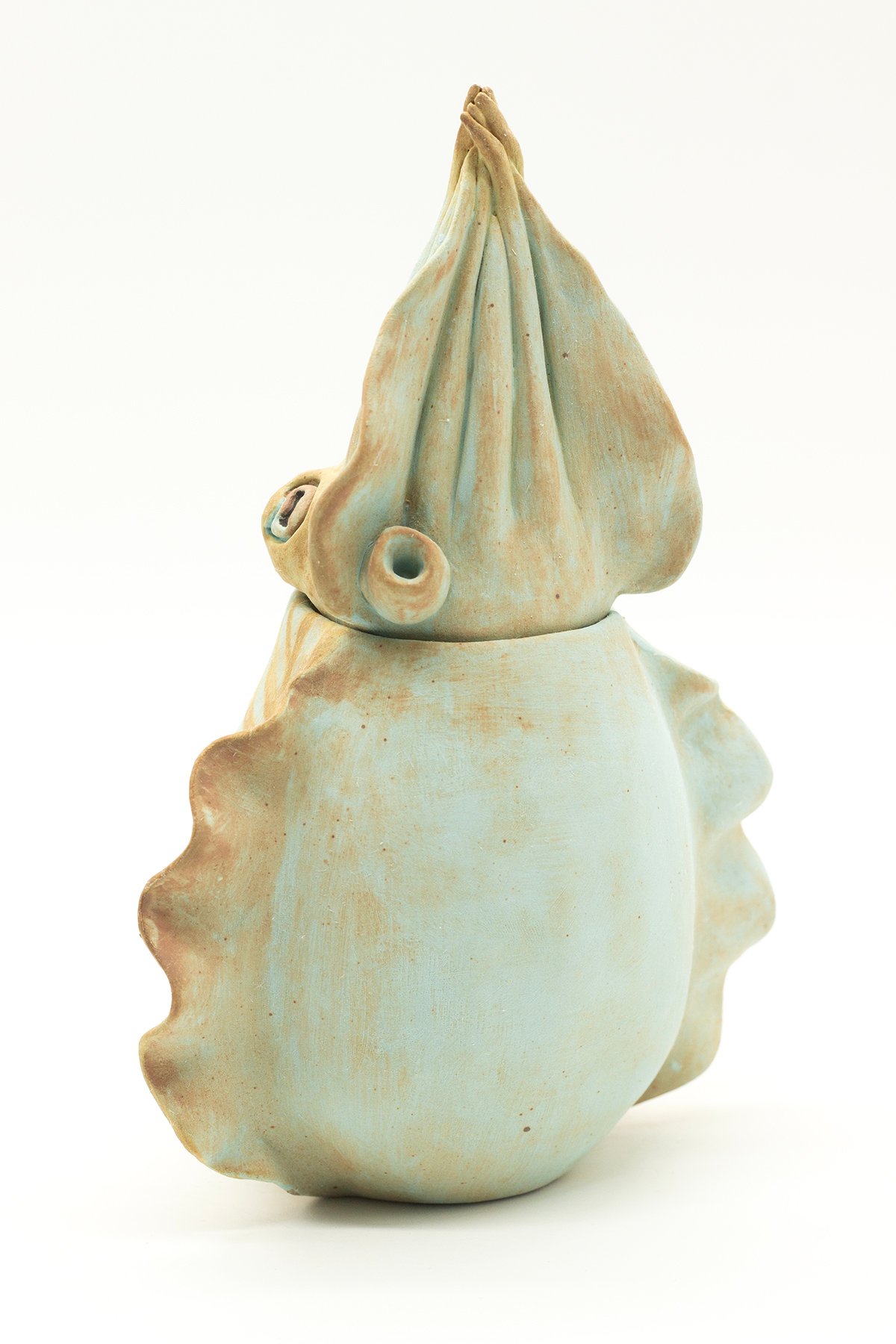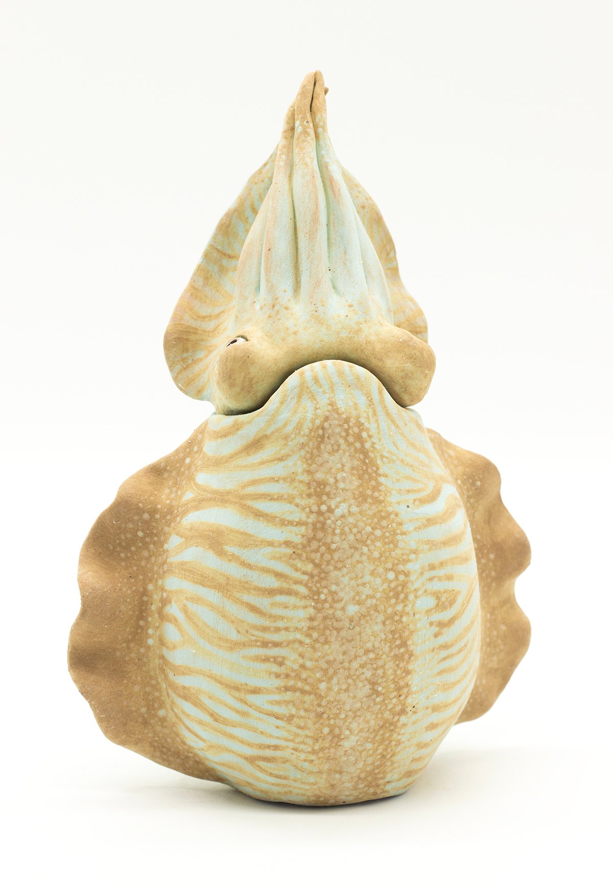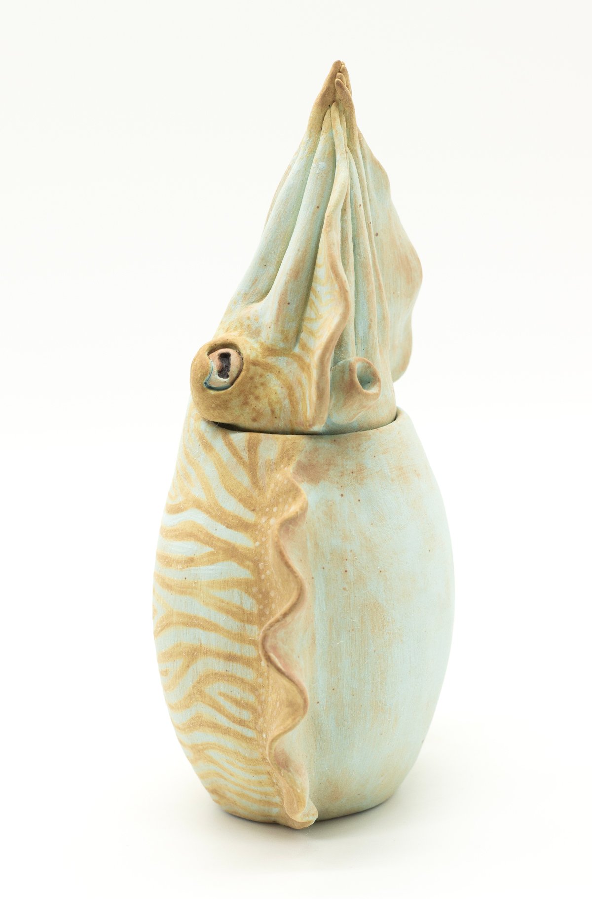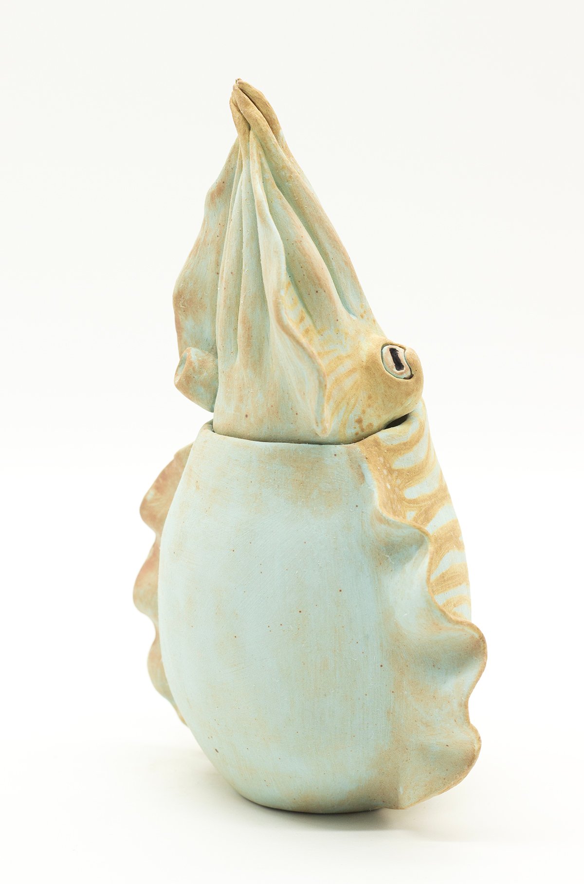 Sculpted cuttlefish vessel built around a wheel-thrown lidded vessel. 5" x 8" x 3"