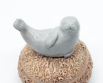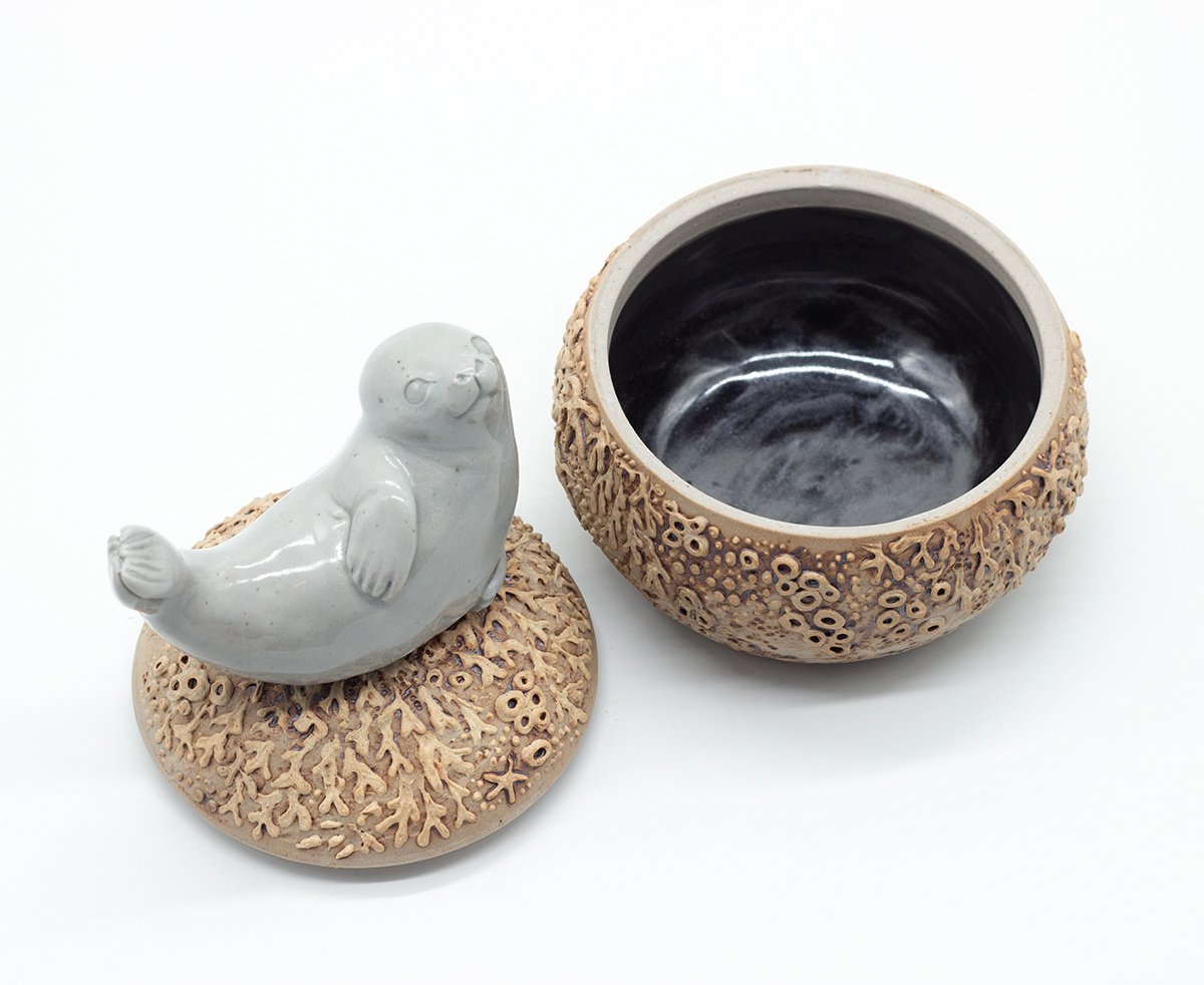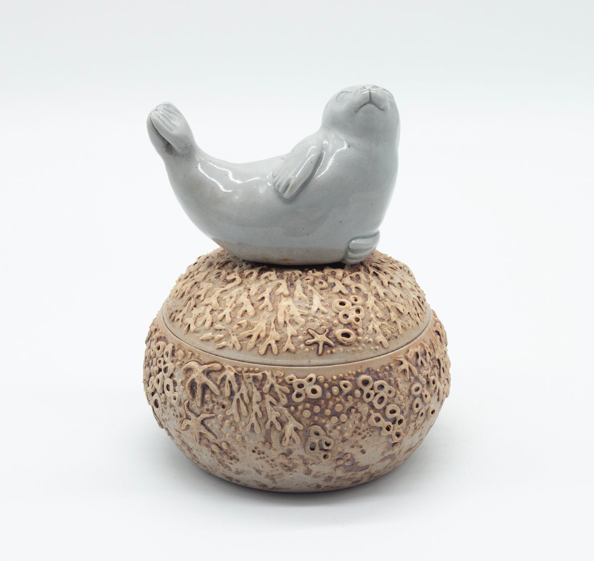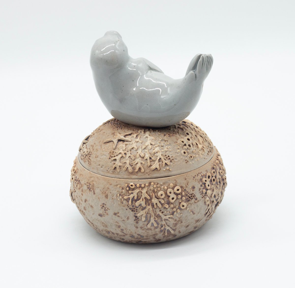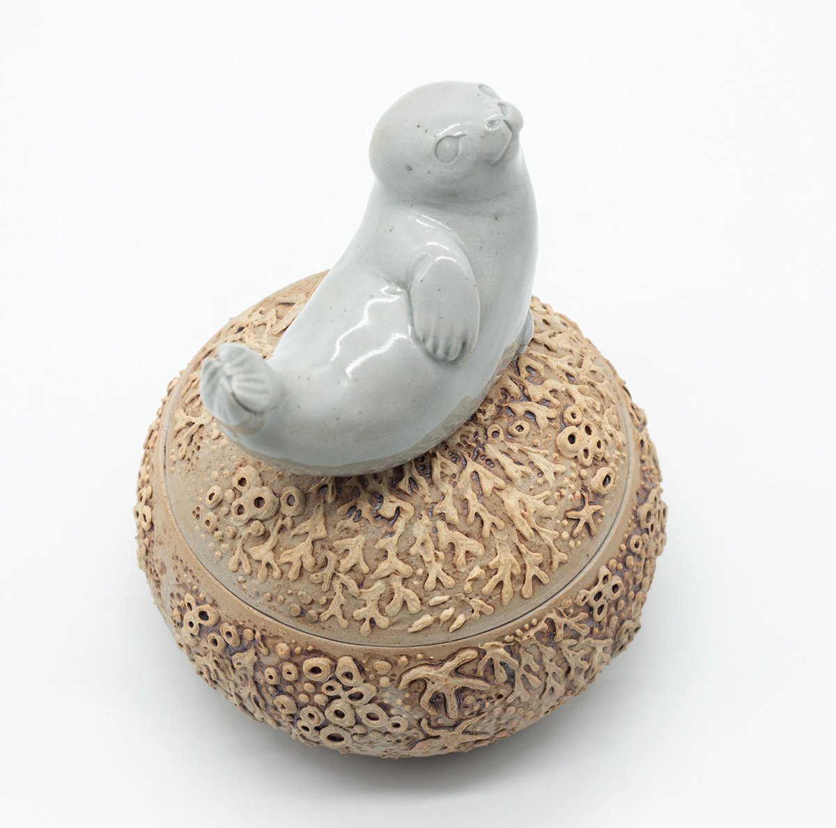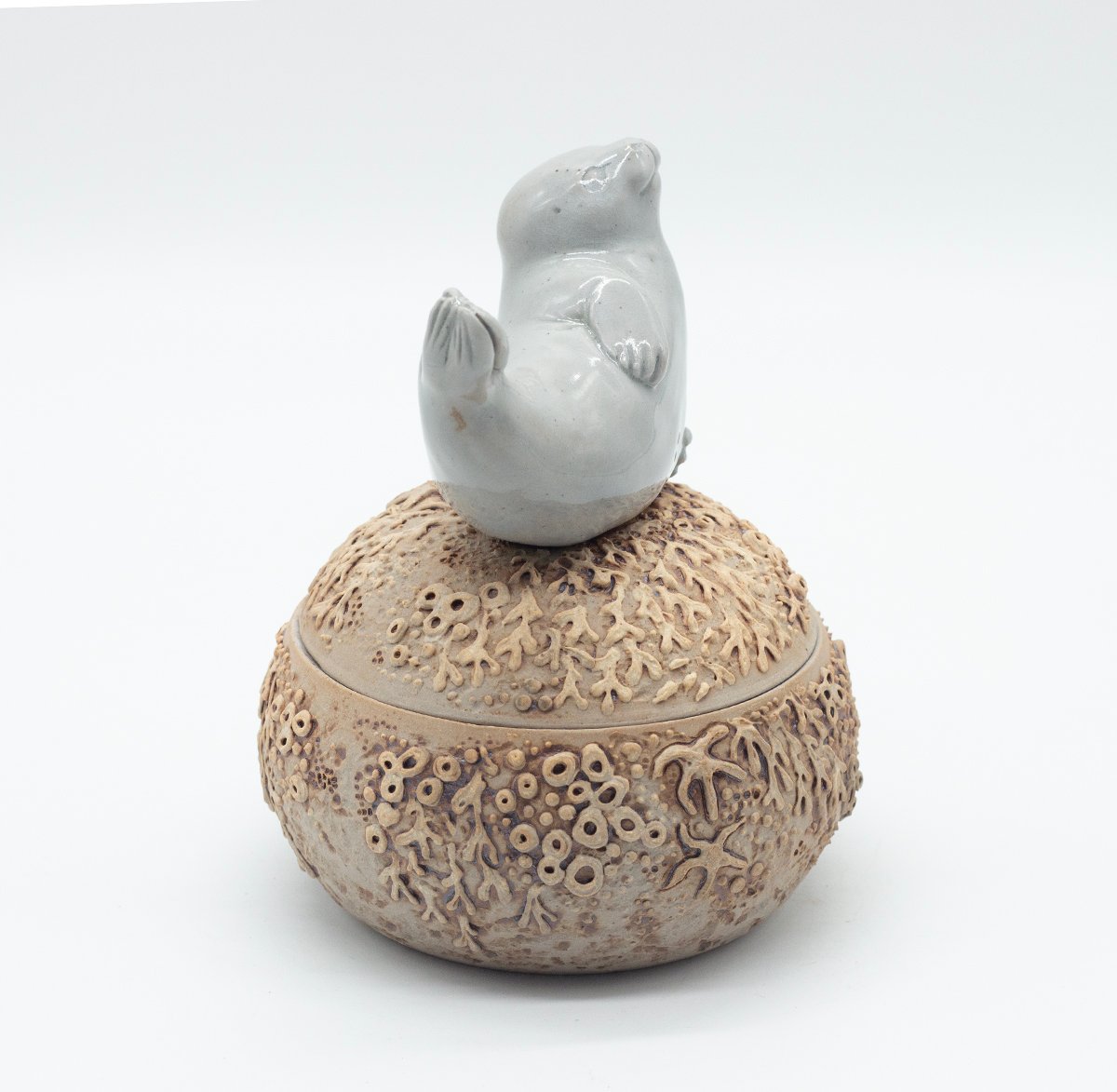 Lidded vessel topped with a sculpted seal and decorated with seaweed and barnacle details.