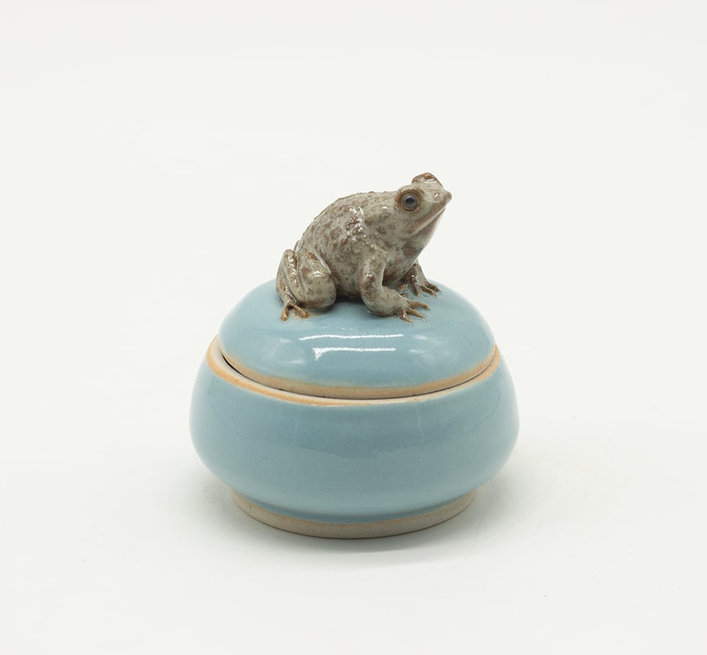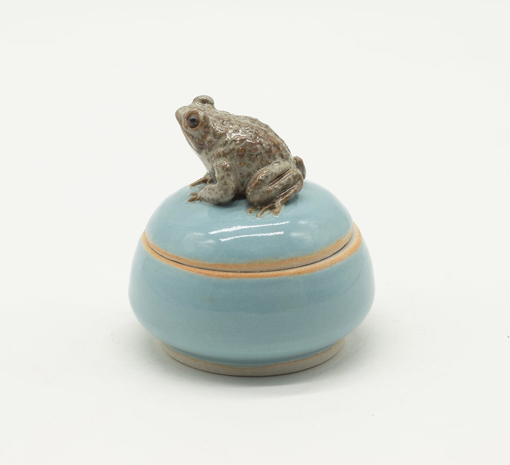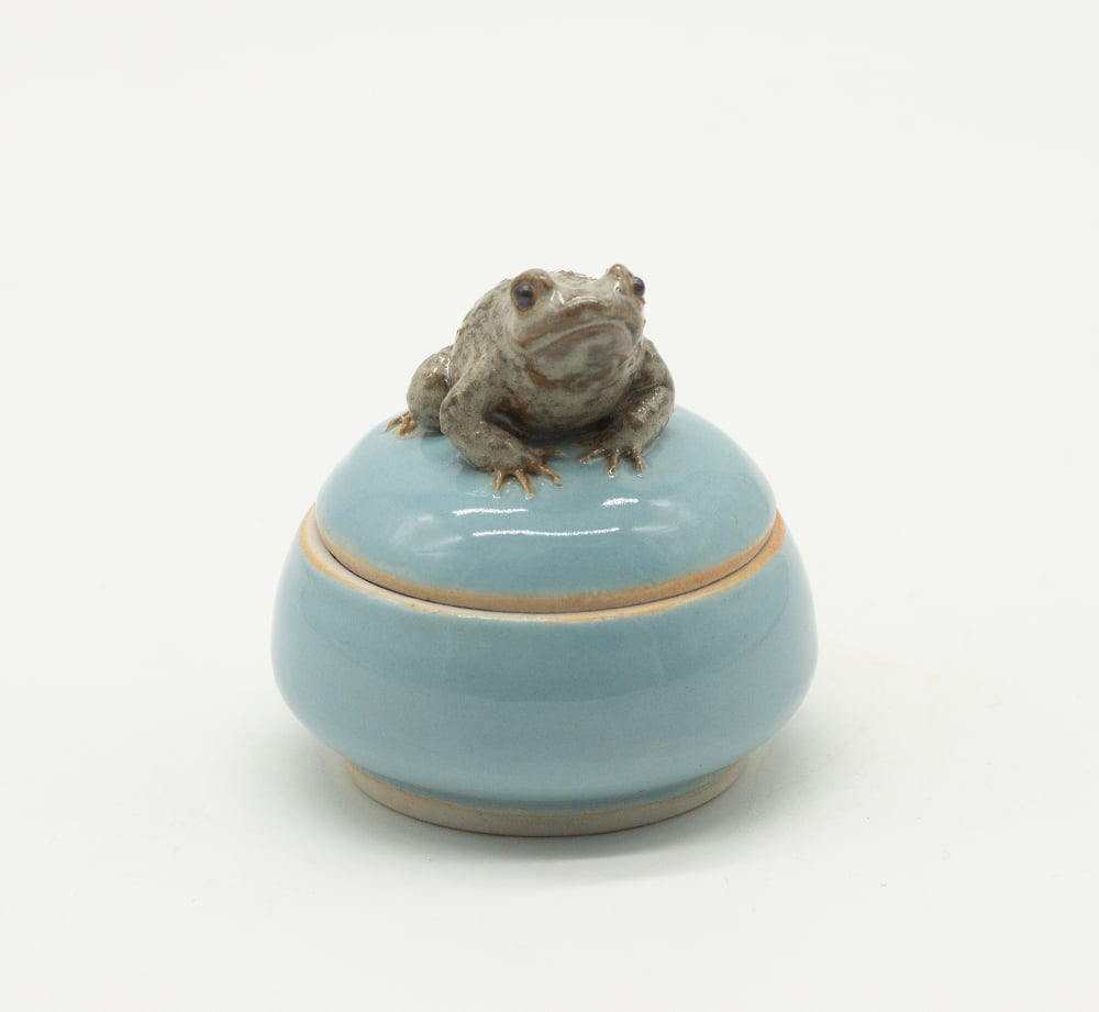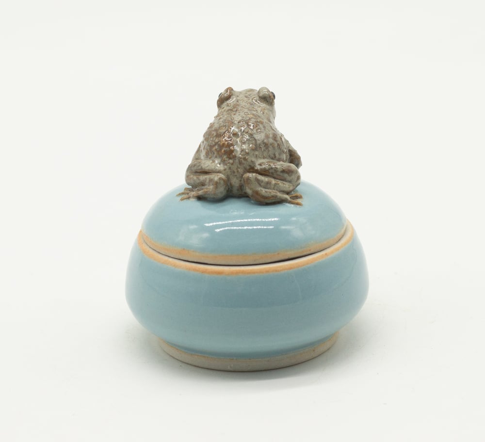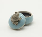 Miniature porcelain lidded box adorned with sculpted frog. 2.5" x 2.5" x 2.5".