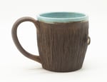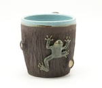 Stoneware mug featuring tree texture details and sculpted porcelain frog. 4" x 6" x 4".