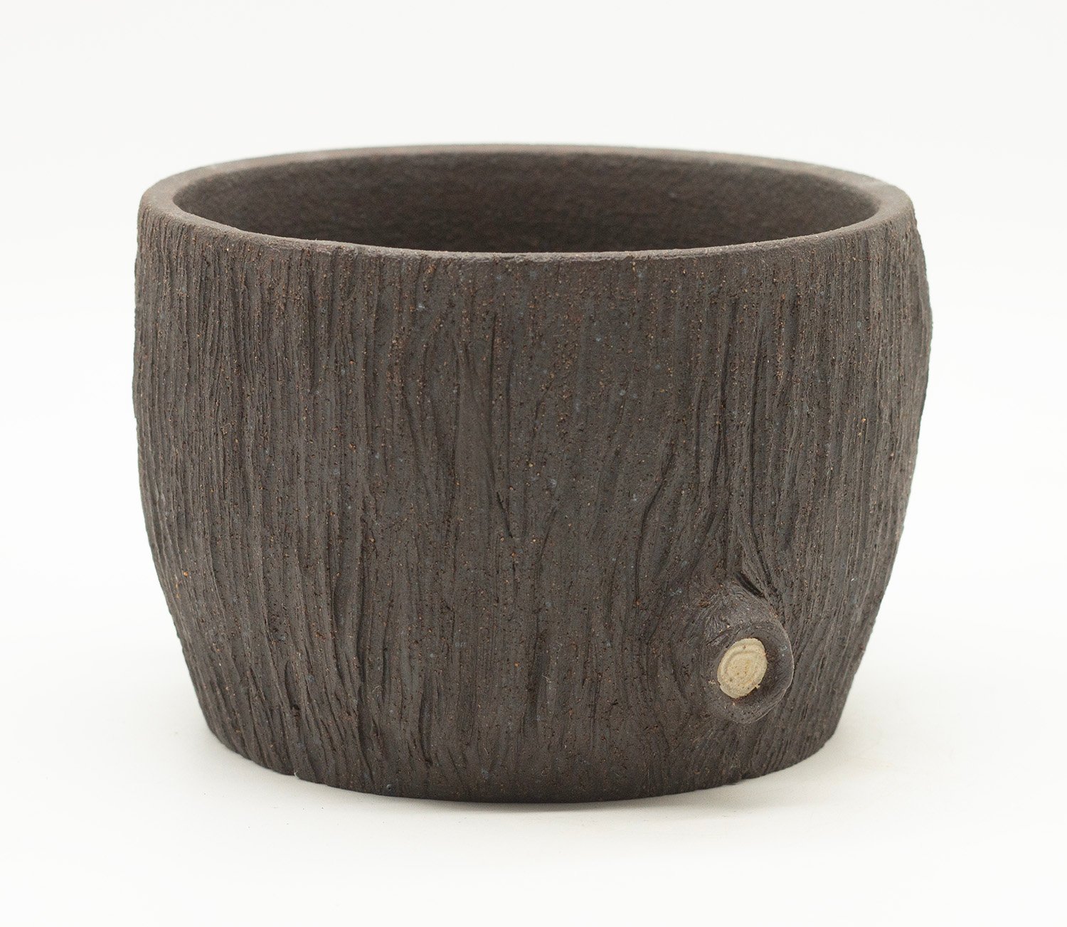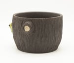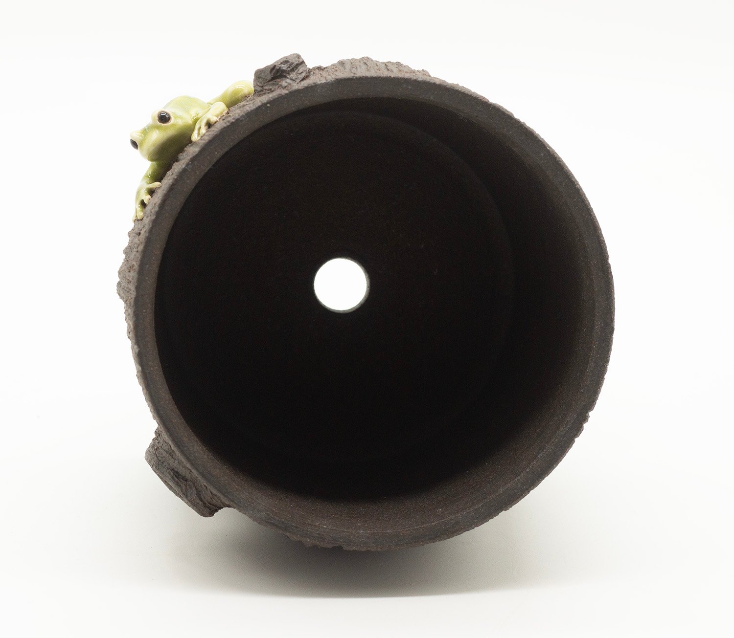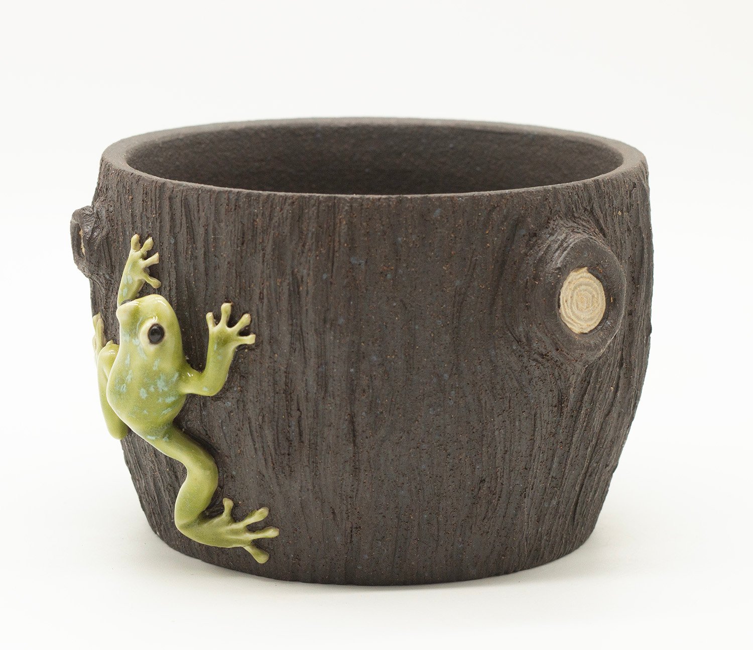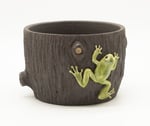 Stoneware planter featuring tree texture details and sculpted porcelain frog. 4" x 5" x 5.5"